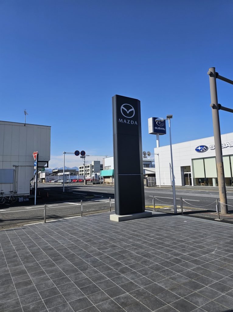 向かいのスバルさんの看板と比べると敢えて円柱の棒にしなかったのは「余白の美」もあるのかな?