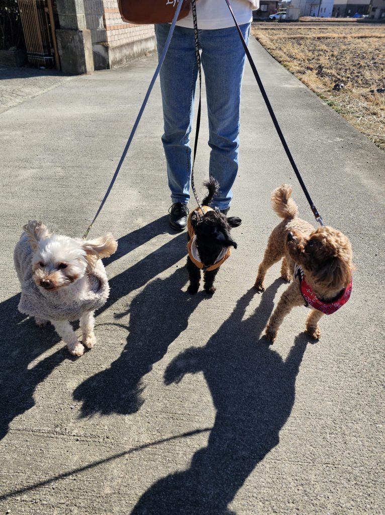 今回はけっこう頑張って3匹とも歩った方だけどわたちゃん(白いトイプードル)はもう外では走ることはない😅