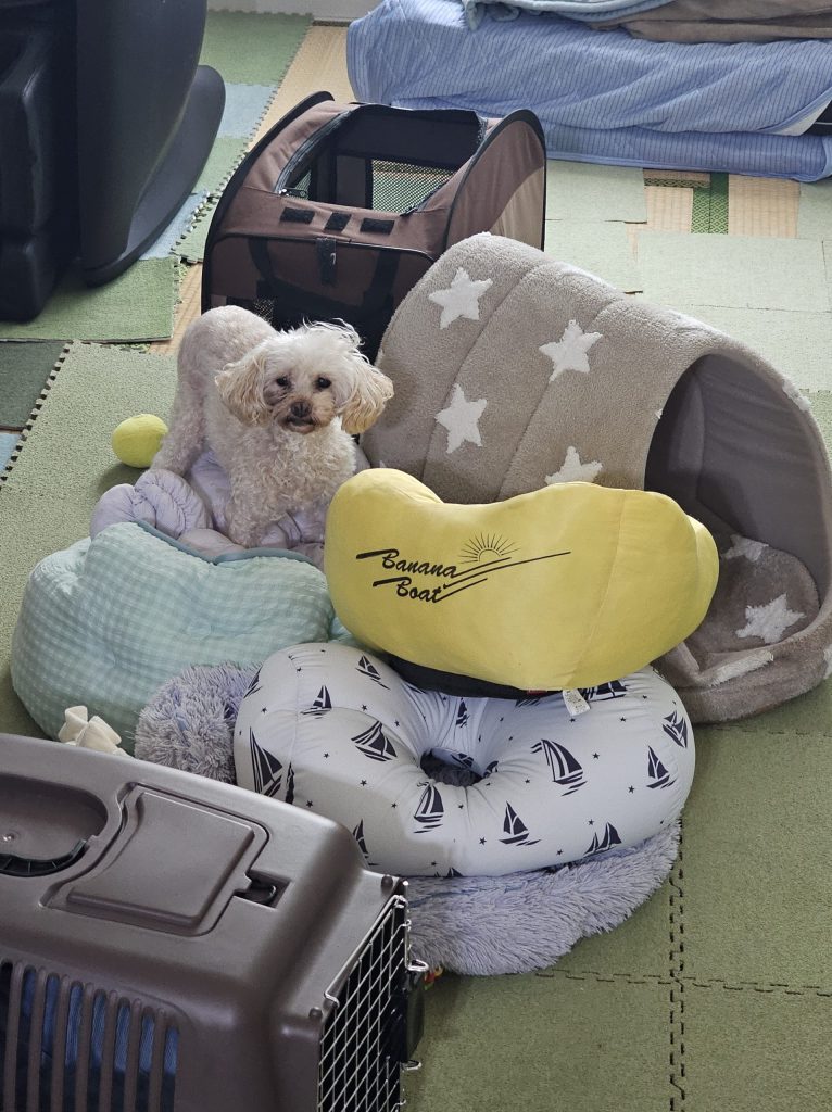 おばあちゃん犬だから、ずっと寝てるのだけどこんだけ寝床があると迷っちゃうのかな?